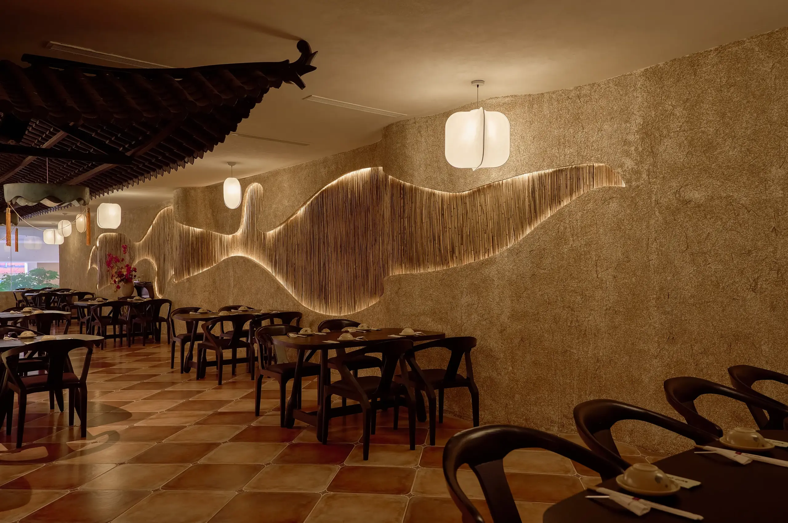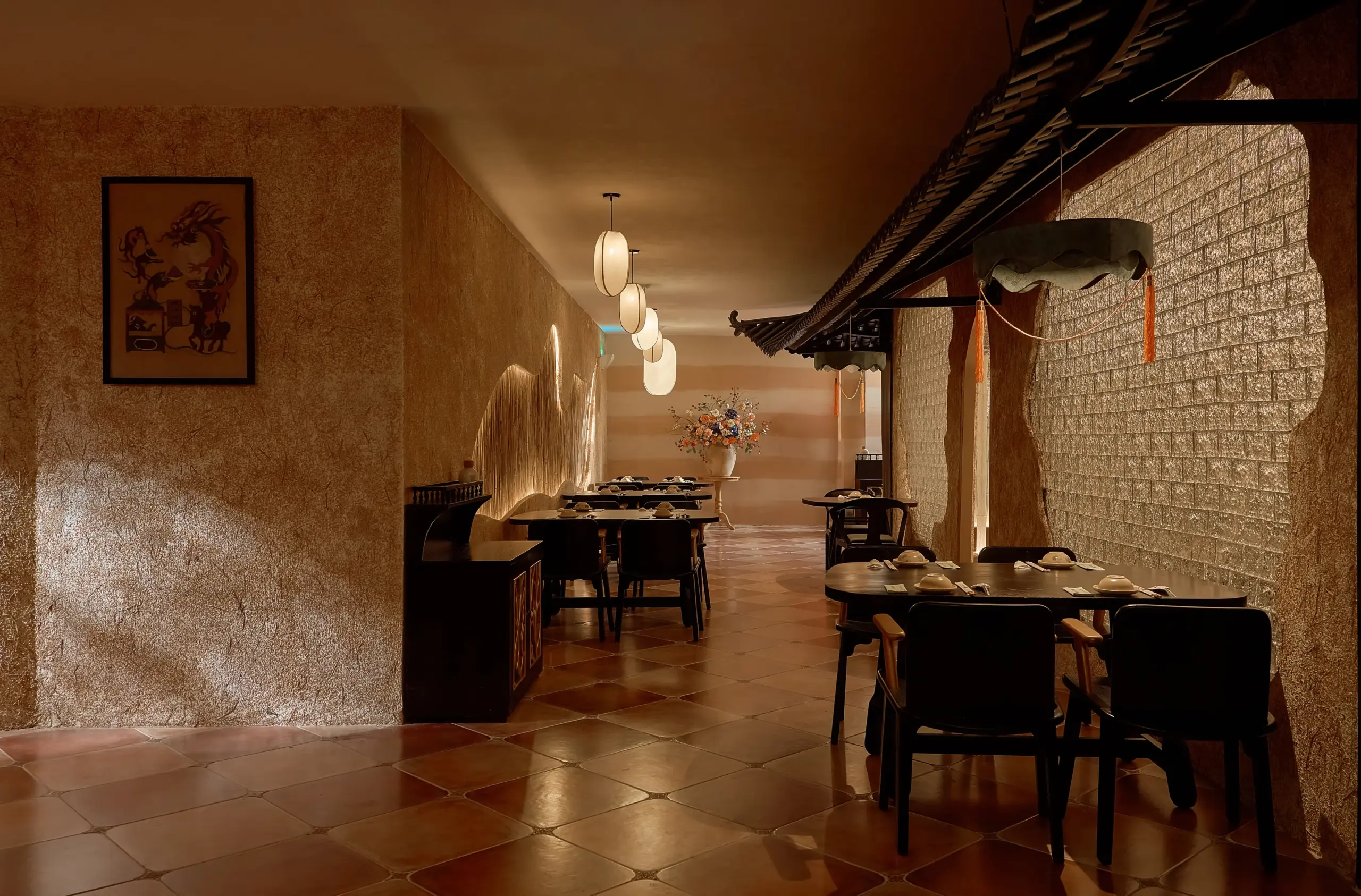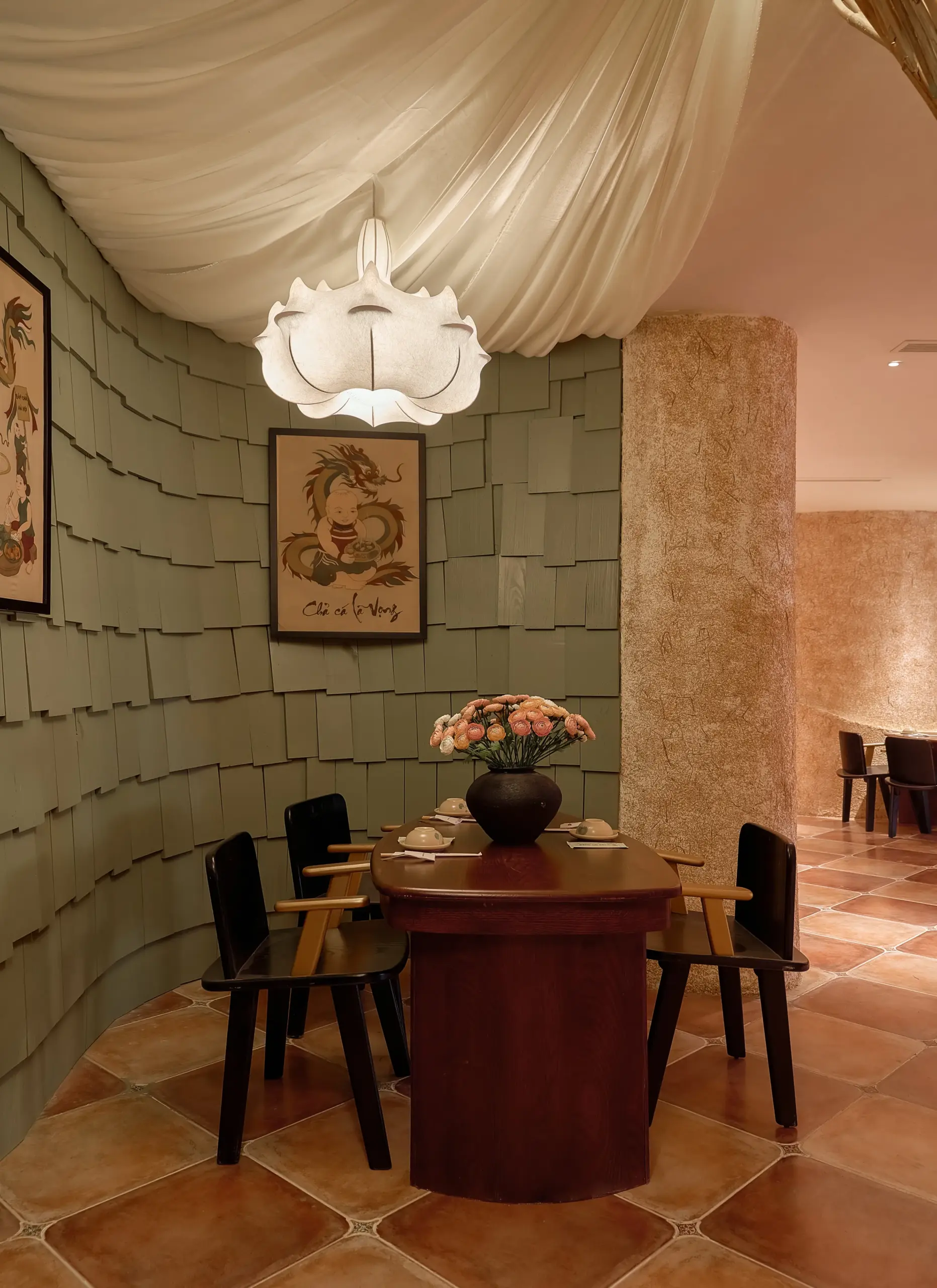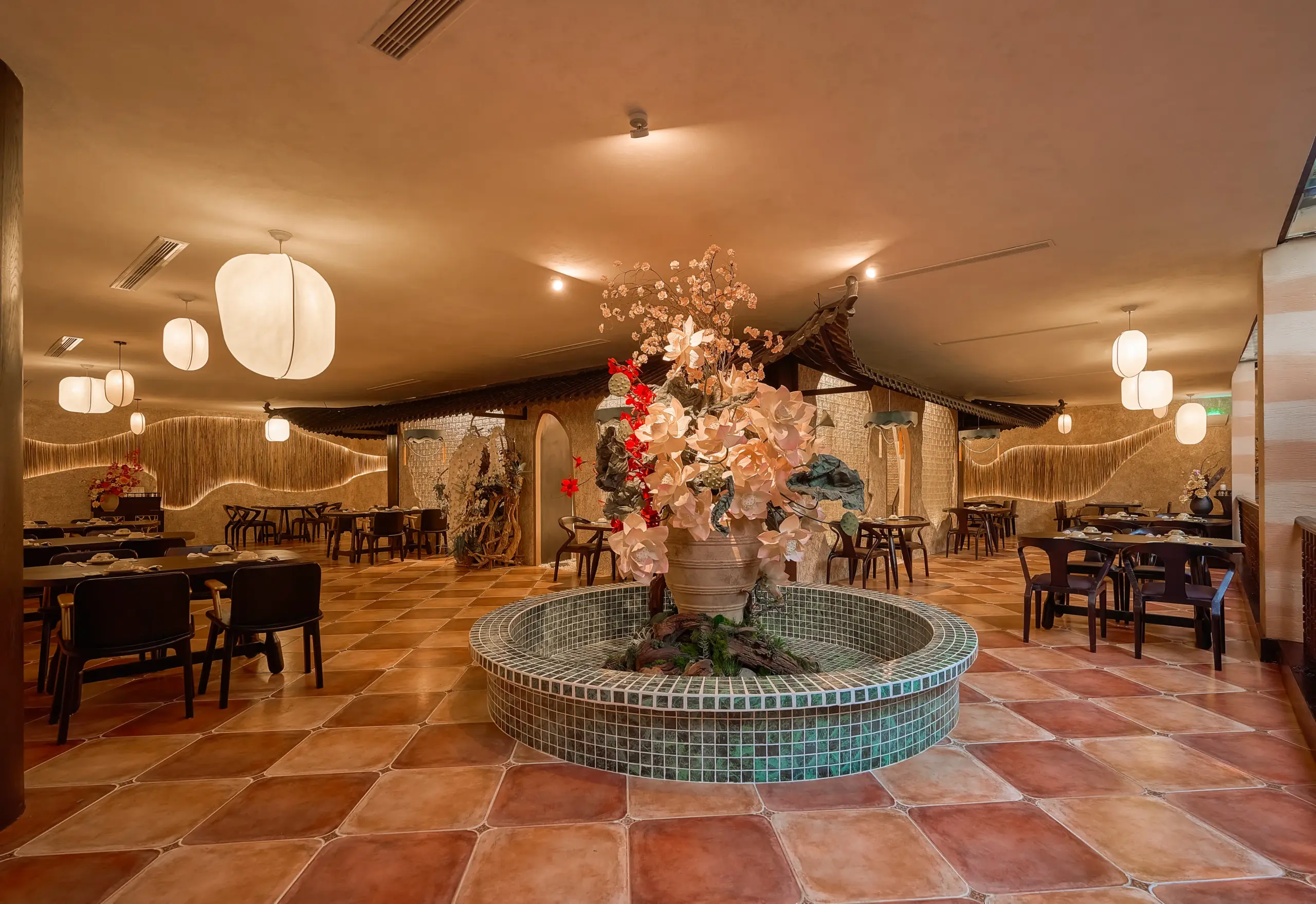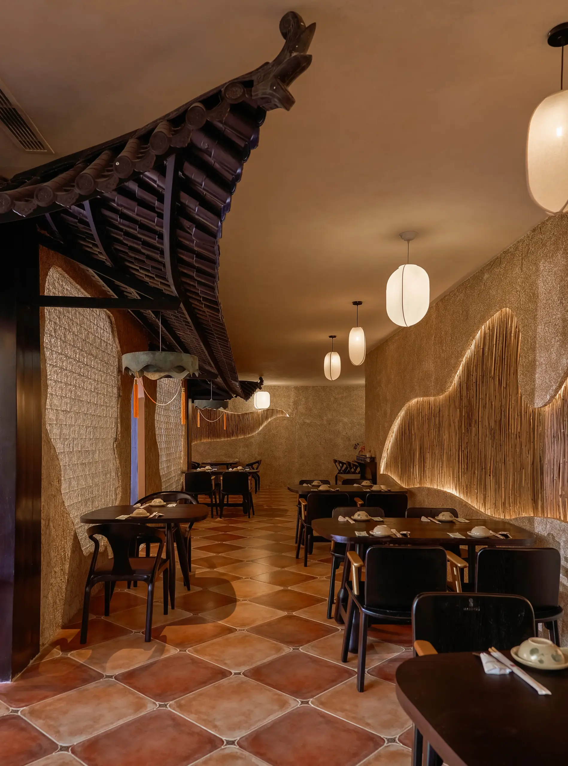 Bước vào Tây Hồ, bạn sẽ cảm nhận sự ấm cúng từ những viên gạch cam-đỏ quen thuộc, được lát tỉ mẩn dưới chân. Những bức tường vỏ trấu uốn lượn mềm mại, điểm xuyết ánh đèn vàng và giếng nước tròn tạo nên một điểm nhấn thi vị, gợi nhớ những hình ảnh thân thuộc của làng quê Bắc Bộ.