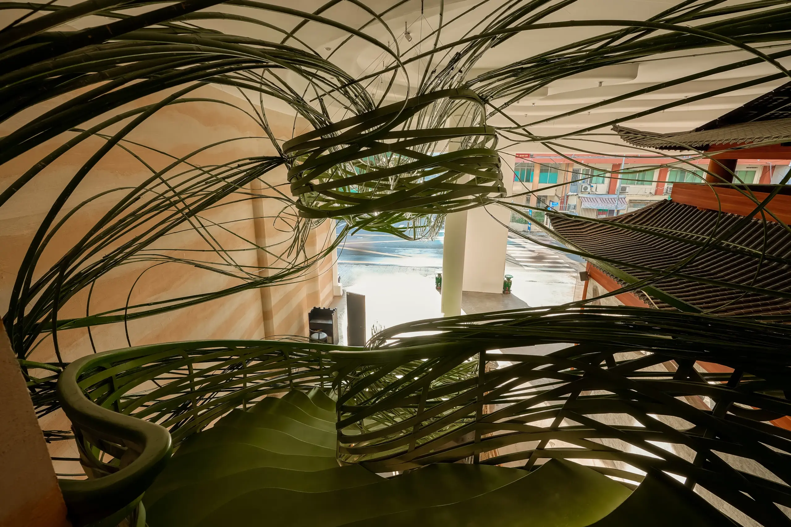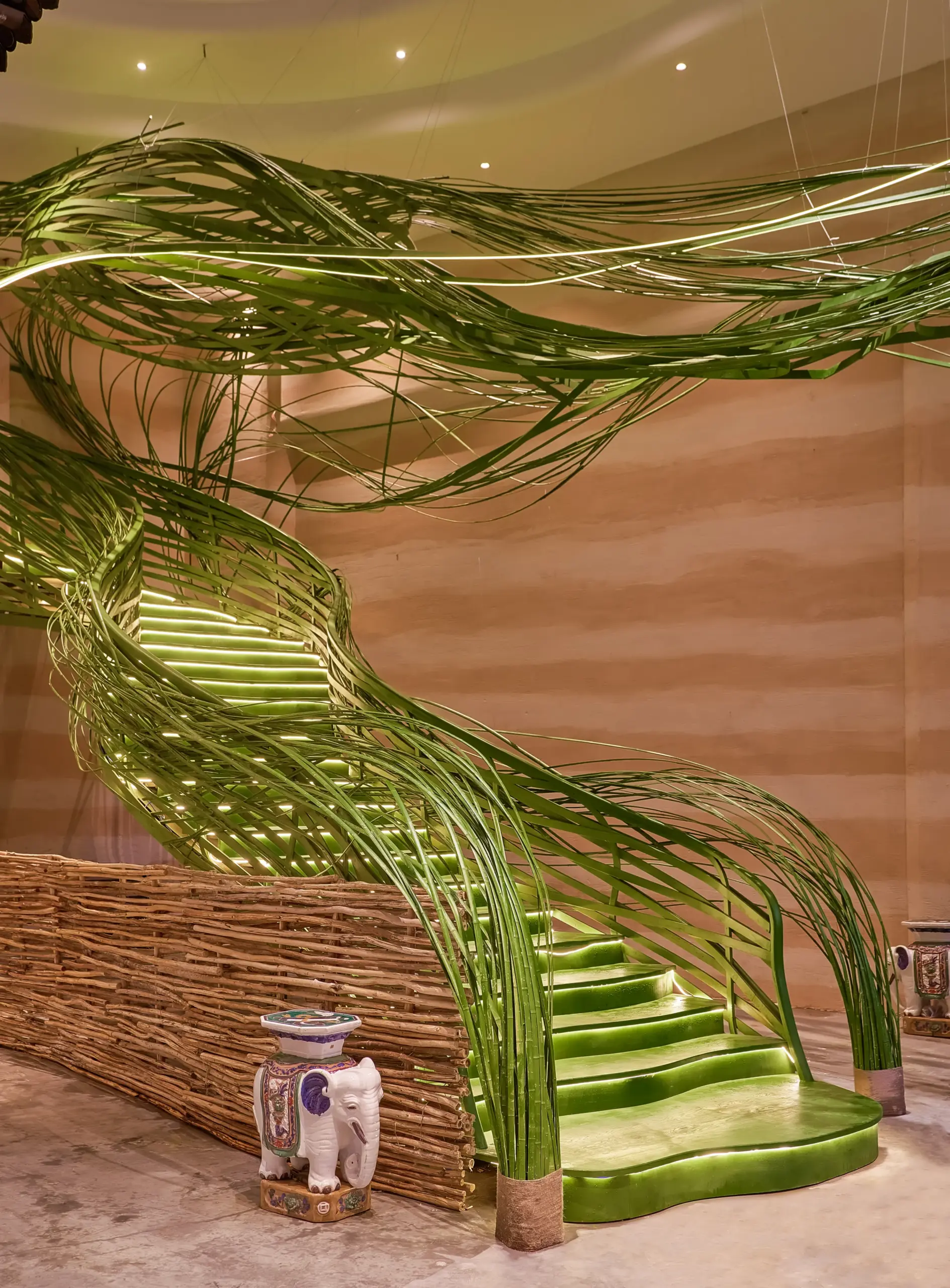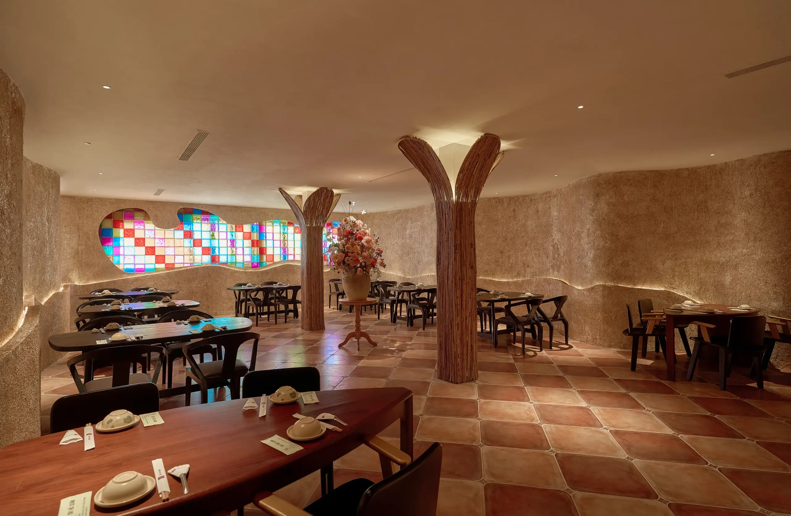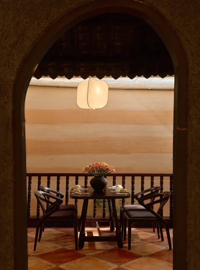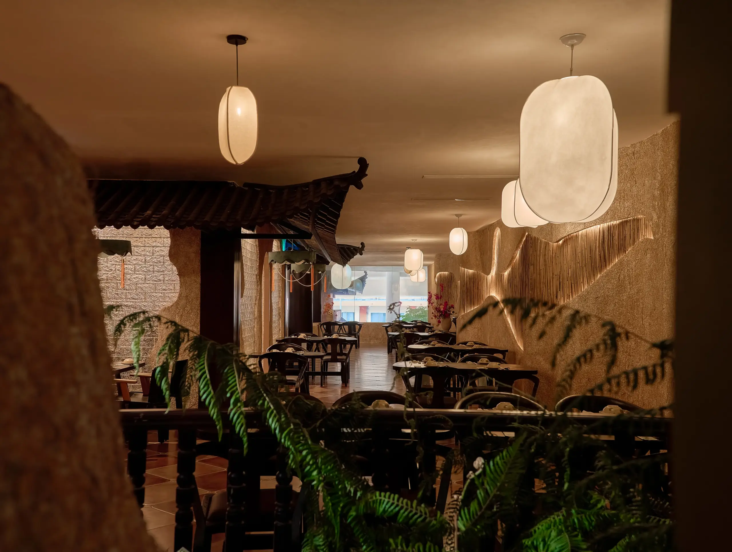 Bước vào Tây Hồ, bạn sẽ cảm nhận sự ấm cúng từ những viên gạch cam-đỏ quen thuộc, được lát tỉ mẩn dưới chân. Những bức tường vỏ trấu uốn lượn mềm mại, điểm xuyết ánh đèn vàng và giếng nước tròn tạo nên một điểm nhấn thi vị, gợi nhớ những hình ảnh thân thuộc của làng quê Bắc Bộ.