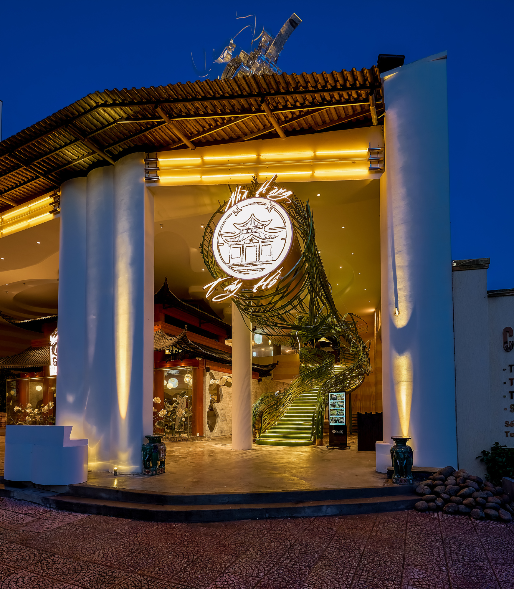 Khi bước vào nhà hàng Tây Hồ, thực khách được dẫn lối bởi một không gian mang sắc thái của “nếp sống kinh kỳ”, xây dựng từ sự hoà quyện đầy chủ ý giữa hai yếu tố kiến trúc đối lập: